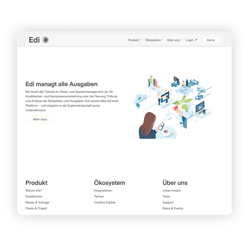Edi – Expense Intelligence vereint alles, was du für dein Reise-, Spesen- und Ausgabenmanagement brauchst. Ob Kreditkarten-, Debitkarten-, Bar-Spesen, Reisedaten oder Auswertungen: Edi deckt den gesamten Prozess ab – von der Planung bis zur Analyse. Und das voll integriert in die bestehende Systemlandschaft deines Unternehmens.