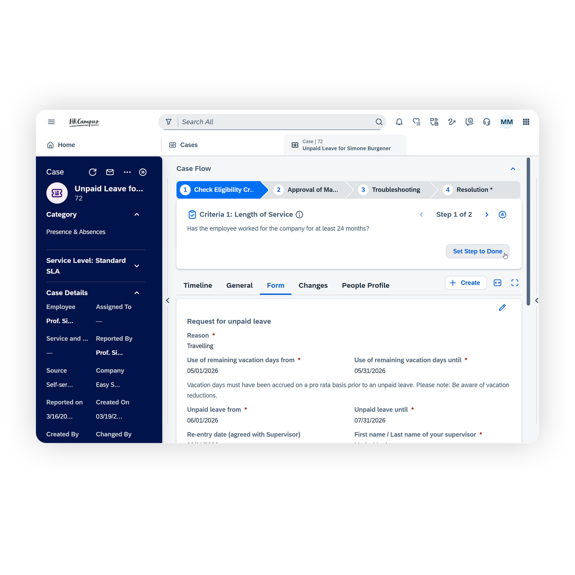 Mit SAP SuccessFactors Enterprise Service Management steuerst du HR-Anfragen zentral, strukturiert und regelkonform. Das Ticketingsystem bildet alle Arten von HR-Anfragen ab und steuert sie über ein zentrales Serviceportal mit automatisierten Workflows. So entlastest du dein HR Services Team, beschleunigst die Bearbeitung von Anfragen und behältst jederzeit den Überblick über alle laufenden Prozesse.