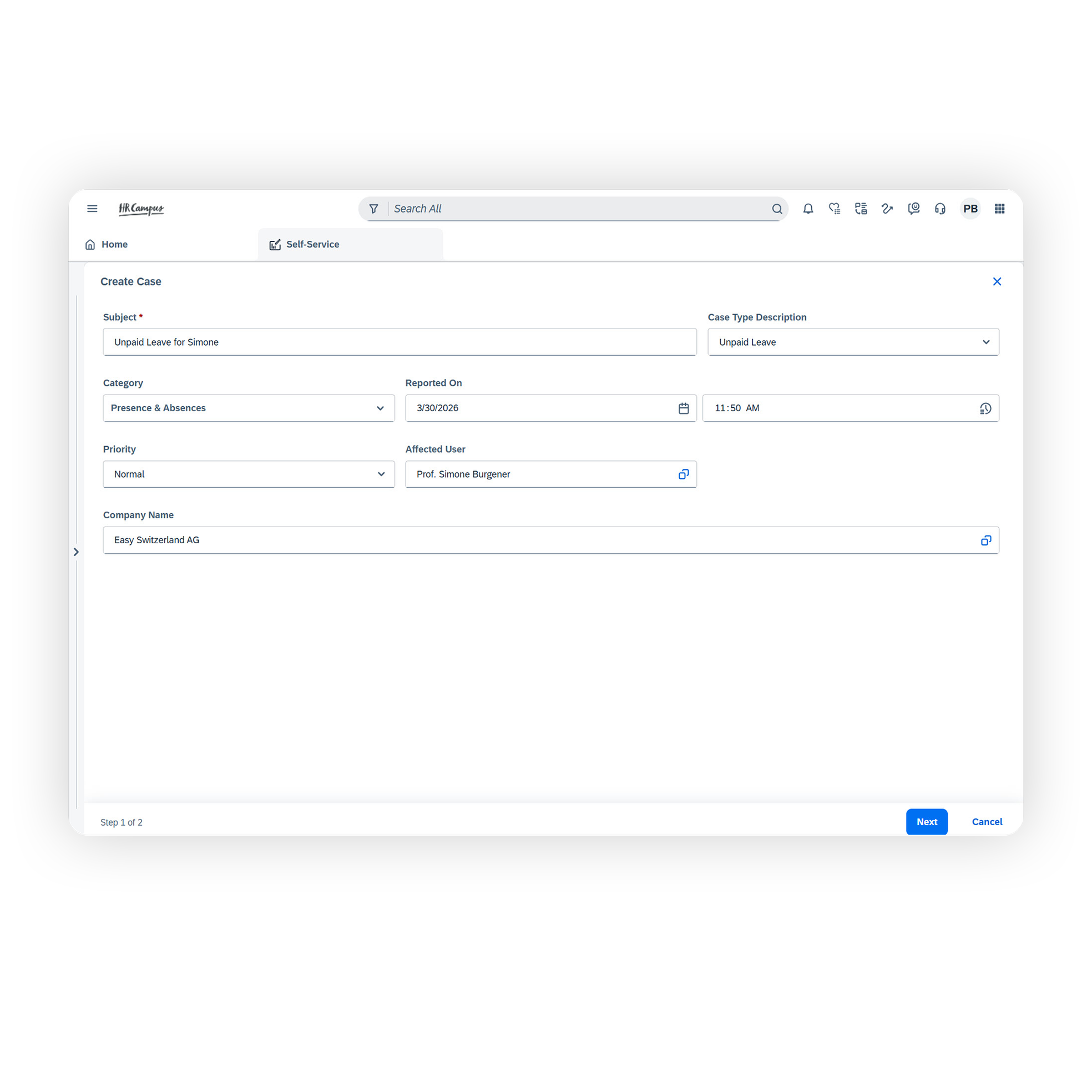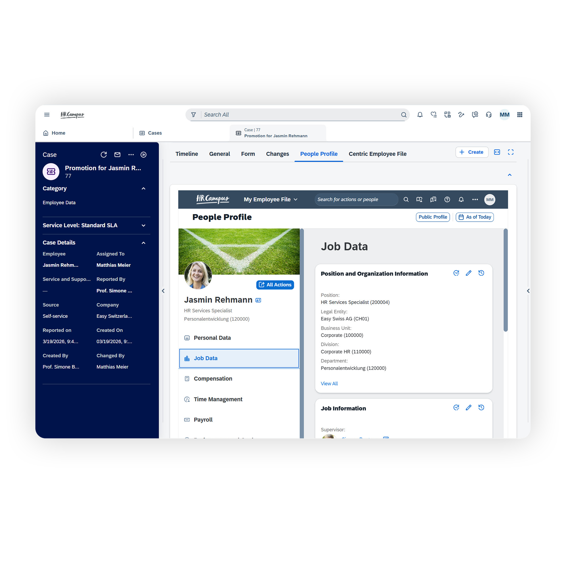 SAP Enterprise Service Management greift direkt auf die aktuellen Daten aus SAP SuccessFactors zu. HR-Prozesse lassen sich direkt aus dem Serviceportal heraus starten. So bleibt die Datenqualität hoch, Doppelpflege entfällt und du behältst jederzeit den Überblick über deine HR-Daten – ohne zwischen verschiedenen Applikationen wechseln zu müssen.