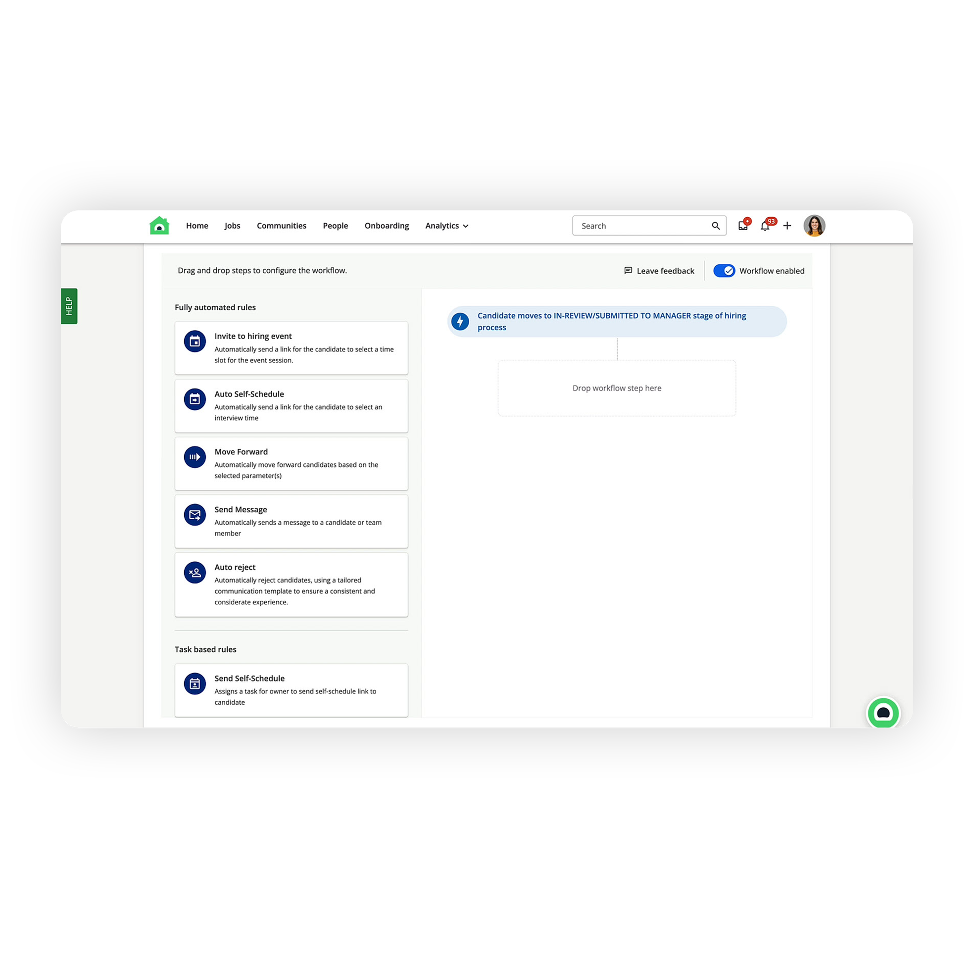 SmartRecruiters unterstützt deinen Rekrutierungsprozess nicht nur technisch, sondern proaktiv. Automatische Interviewplanung, individuelle Erinnerungen für Vorgesetzte und KI-gestützte Vorschläge aus Talentpools führen dich effizient und zielführend durch jede Phase der Rekrutierung – strukturiert, zeitsparend und mit klarer Userführung.