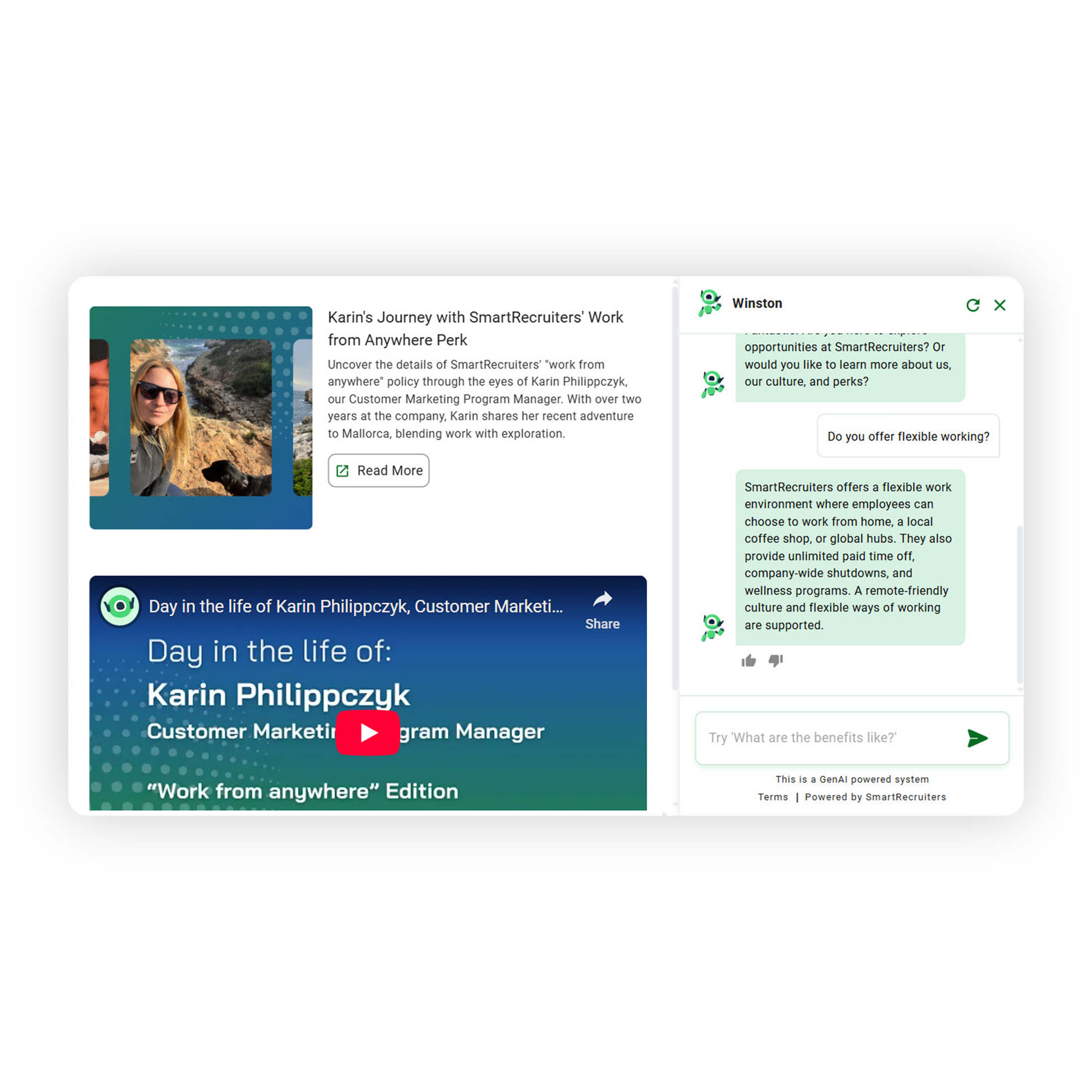 SmartRecruiters stellt die Candidate Experience ins Zentrum, ohne zusätzliche Arbeit für HR. Die integrierte KI «Winston» beantwortet Fragen direkt auf deiner Karriereseite und steigert so die Bewerbungsrate. Über WhatsApp, E-Mail oder SMS bleibst du nah an den Kandidat:innen und reagierst dank Integrationen zu Outlook, Teams oder Slack schnell und unkompliziert.
